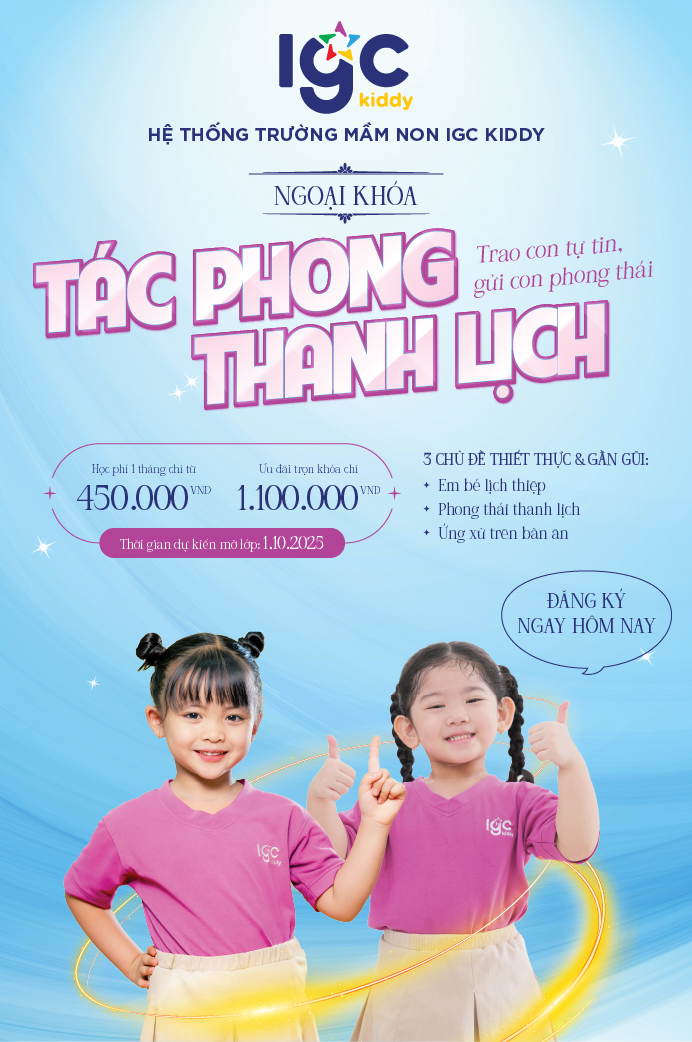 Lần đầu tiên, IGC Kiddy triển khai chương trình ngoại khóa “Tác phong thanh lịch” dành cho các bé gái từ 3–5 tuổi, với mục tiêu: - Hình thành thói quen ăn mặc gọn gàng, lịch sự - Rèn luyện các phép lịch sự cơ bản trong giao tiếp - Xây dựng tác phong tự tin, duyên dáng và thanh lịch Nội dung chương trình gồm 3 chuyên đề: - Em bé lịch thiệp - Phong thái thanh lịch - Ứng xử trên bàn ăn Lớp học được dẫn dắt bởi đội ngũ giáo viên có chuyên môn trong lĩnh vực kỹ năng sống, nghệ thuật ứng xử và phát triển nhân cách, mang đến cho trẻ những trải nghiệm học tập sinh động, thiết thực và giàu ý nghĩa. Với chương trình này, phụ huynh có thể yên tâm gửi gắm con yêu, đồng thời cảm nhận được giá trị khác biệt trong dịch vụ giáo dục tại IGC Kiddy – nơi trẻ được bồi đắp tri thức, nhân cách và phong thái toàn diện.